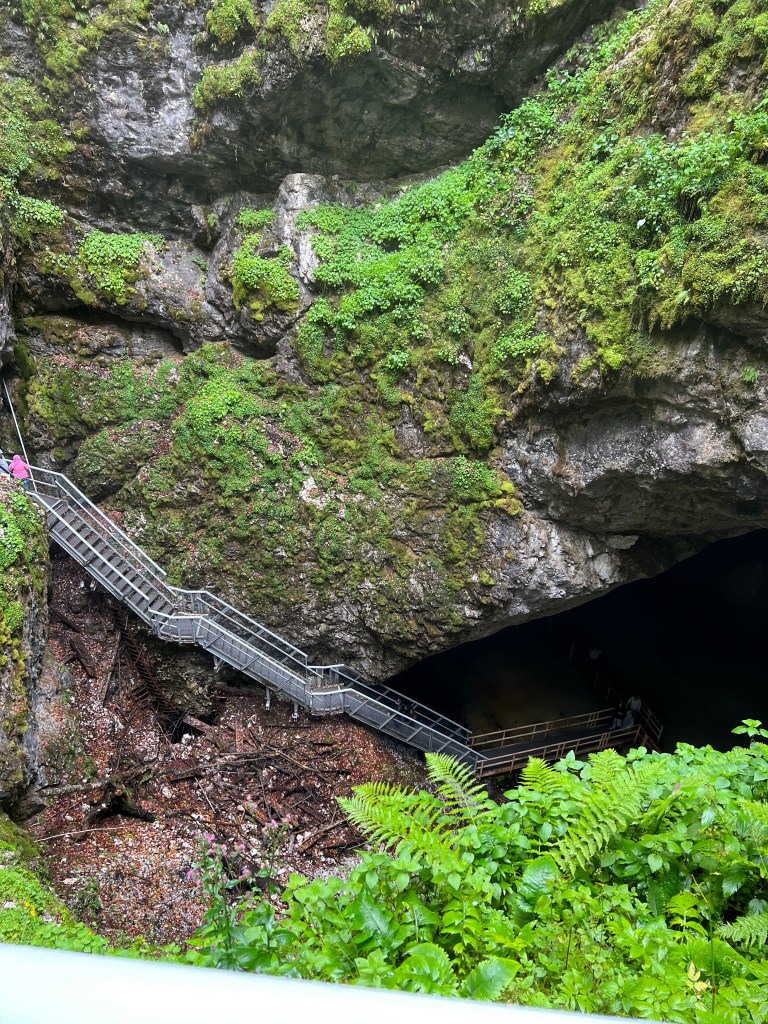 Die Höhle war super spektakulär. Es ging auf Eisentreppen min 100m in die Tiefe, wobei es mit jedem Schritt nach unten immer kälter wurde. Zum Glück hatten wir unsere Regenjacken und ein Pulli an. Da es eh recht regnerisch war. Unten angekommen, ging es direkt aufs Eis. Also nicht wirklich, da ein Rundweg durch die Höhle aus Holz auf dem Eis angelegt wurde.