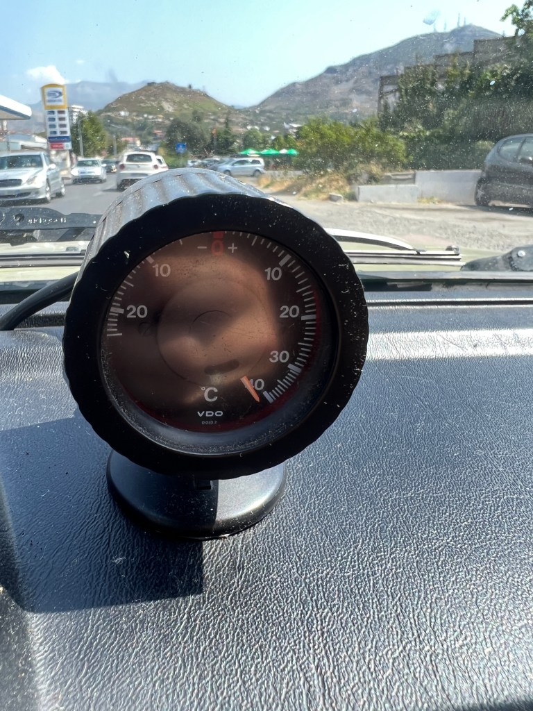 An der Grenze angekommen, war zum Glück wieder nur eine kleine Schlange, wir mussten aber trotzdem ca 1 Stunde in brütender Hitze stehen. Unser Innenthermometer geht nur bis 40 grad, der Zeiger war auf Anschlag. Also 45-50 grad waren bestimmt im Auto.
