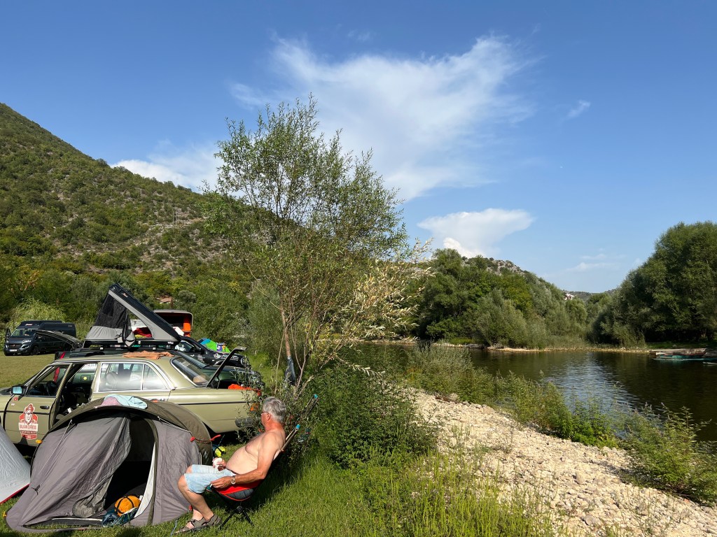 Unsere Party fand in Rijeka Crnojevica auf einem kleinen echt schönen Zeltplatz statt. Das SAC Team hatte schon alles vorbereitet und wir konnten direkt unser Zelt aufstellen. Das ganze Dorf half mit die Party auszurichten. Unter anderem hatte einer ein Boot mit dem man durch den Nationalpark den Flussarm entlangfahren kann. Die Einheimischen nennen das ihre Amazonas Flussfahrt. Am Ende der Tour gibt es auch Bademöglichkeiten. Sowas lassen wir uns natürlich nicht entgehen. Nach deftigem Grill Abendessen, zubereitet von den Einheimischen, ging es dann aufs Boot. Ich sag euch, was für eine Fahrt. Das war richtig schön. Und zum Schluss dann vom Boot ins Wasser springen. Eine herrliche Abkühlung.
