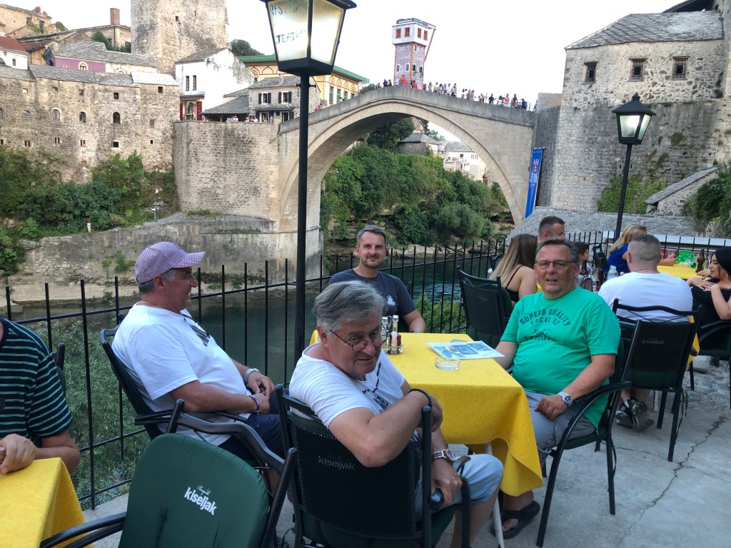 Nun sollte es zur Grenze gehen, wir wählten einen Grenzübergang der auf der direktesten Strecke nach Mostar lag, dort angekommen, ca 2,5km davor standen schon die ersten Autos. Also hinten angestellt. Wir sind dann in einer Stunde ca 300m weit gekommen. Die Leute vor uns gingen zur Grenze und zählten auf dem Rückweg ca. 180 Autos vor uns. Das haben wir hochgerechnet und eine Wartezeit von ungefähr 4-5 Stunden prognostiziert. Wir entschieden uns dann die Warterei abzubrechen und einen Grenzübergang etwas südlicher zu versuchen. Der war knapp 30min entfernt. Dort dauerte es dann nur ungefähr 45min und wir waren durch. Dadurch hatten wir natürlich min 3h verloren. Wir sind dann von dort direkt nach Mostar gefahren wo wir um 19 Uhr ankamen. Wir sind dann gleich mal von unserem Hotel mitten in der Innenstadt zur Brücke gelaufen. Sie war direkt um die Ecke (300m). Echt schön.