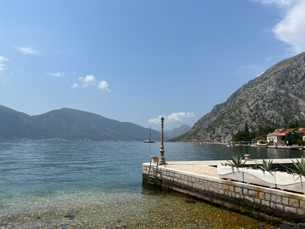 Vom Zeltplatz ging es zur Bucht von Kotor. Auf der Scenic Route 3, über viele Berge, erreichten wir diesen kleinen schönen Ort. Leider war er so überlaufen, dass wir uns entschieden nur langsam durchzufahren. Ein paar Kilometer weiter dann, als es nicht mehr so voll war entdeckten wir ein kleines Örtchen direkt am Wasser, welches uns zu einem spontanen Badestop animierte. Das war echt toll.